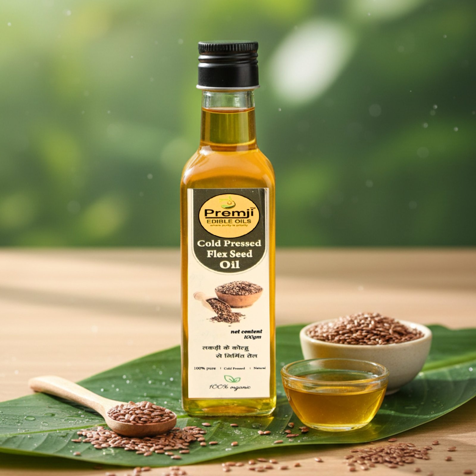 Cold-pressed flaxseed oil (अलसी का तेल), also known as linseed oil, is a nutrient-rich oil extracted from the seeds of the flax plant (Linum usitatissimum) using a mechanical pressing method without the use of heat. This gentle extraction process helps to preserve the oil’s natural flavors, aroma, and nutritional properties.