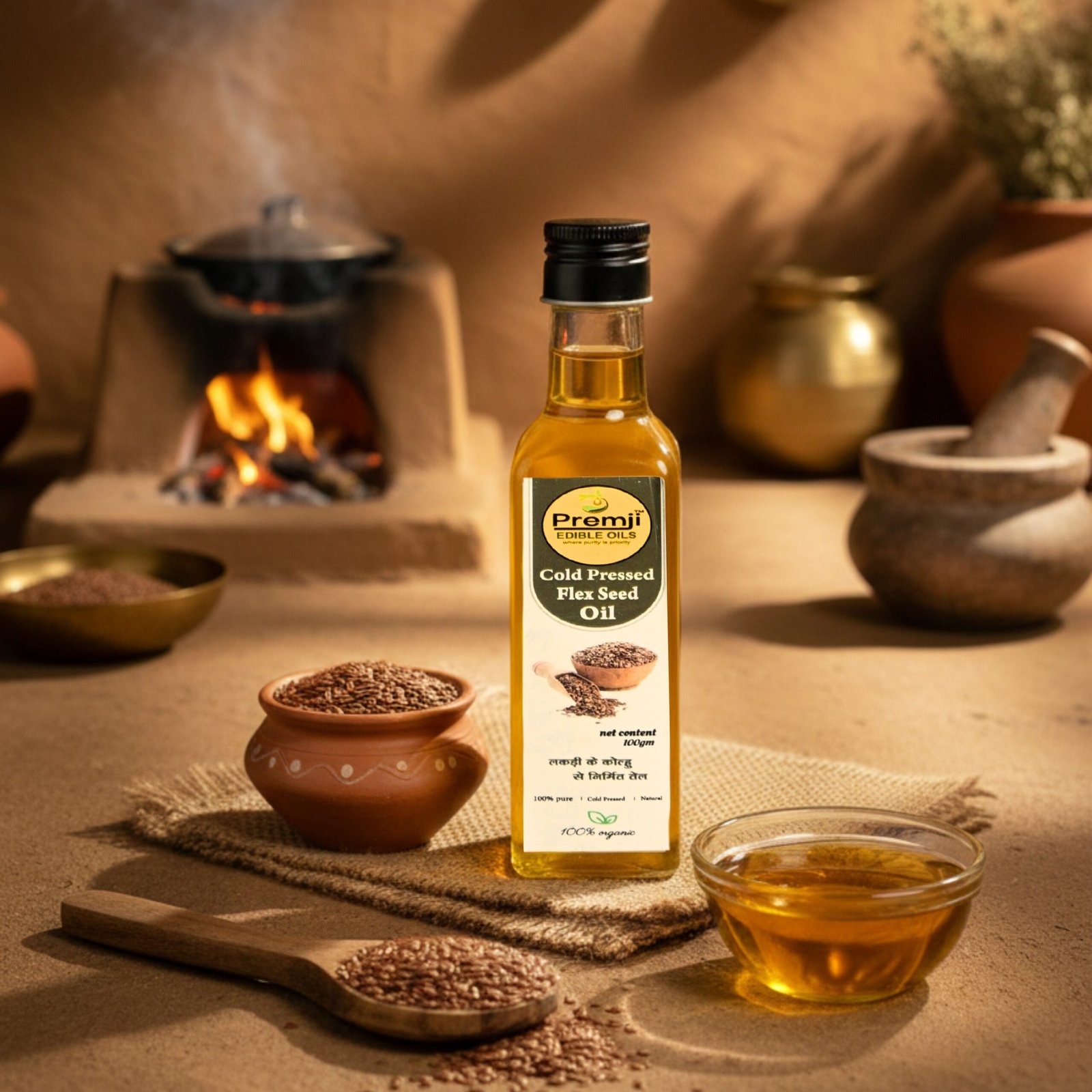 This oil is ideal for moisturizing dry and mature skin it rejuvenates skin by making it firm and supple when used as body oil, it hydrates skin making it smooth and soft. Nutrient-Rich: Our Oil is Packed with essential Nutrients, Antioxidants, and healthy fats, promoting overall well-being. 100% pure, unrefined and free from preservative/chemicals. Flax seeds are added to wooden part of cold press, oil is extracted pressing these seeds against wooden chuck/ kolhu at room temperature.
